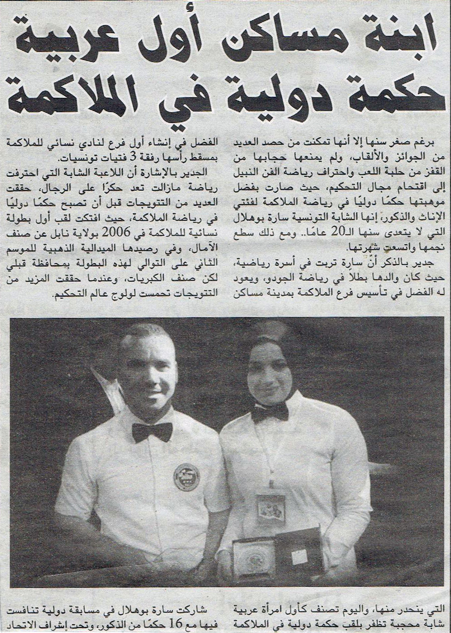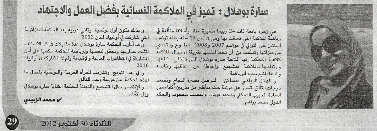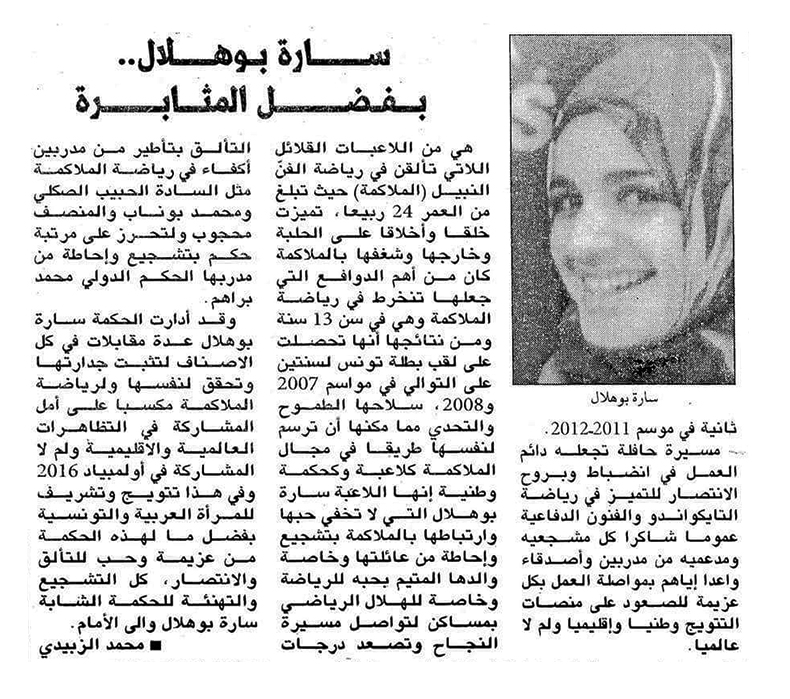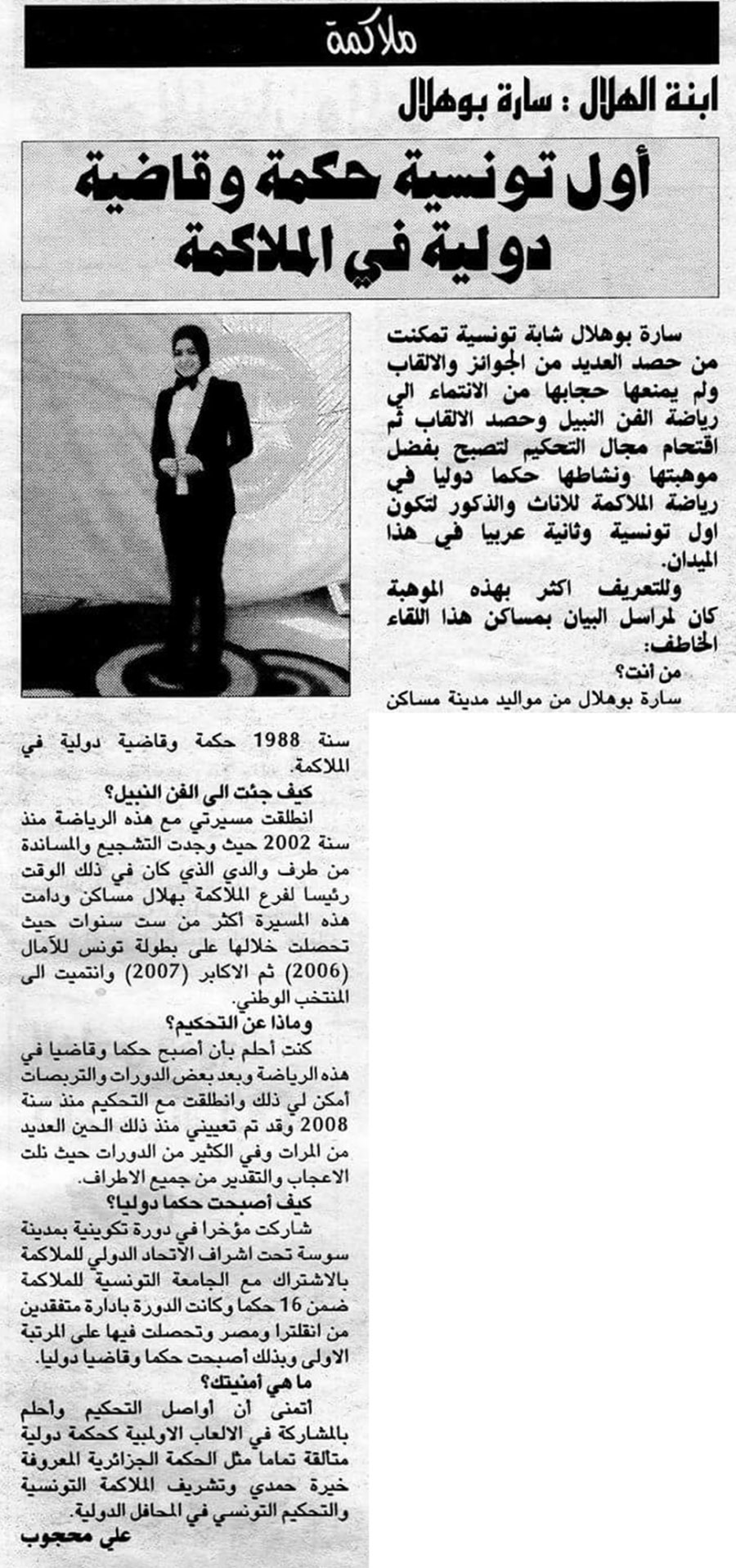 5. المغرب اليوم (16 جوان 2017): التونسية سارة بوهلال أول محجبة تقتحم مجال التحكيم الدولي في الملاكمة